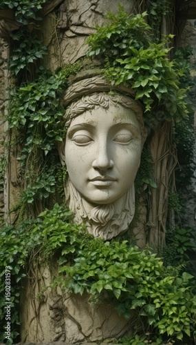Ancient ivory stone, heavily weathered, draped in verdant ivy and moss , ruin, element