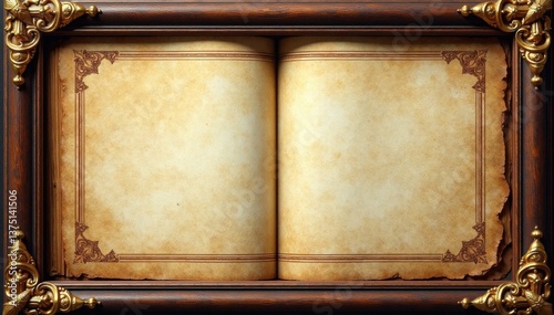 Ancient manuscript pages framed in intricately carved wooden frames with golden scroll borders, ancient manuscripts, antique frames