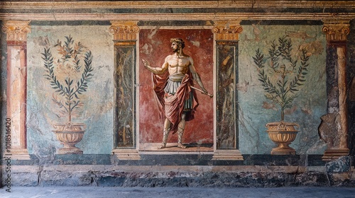 Ancient mural depicting a figure surrounded by ornamental flora, showcasing classical art and historical significance.