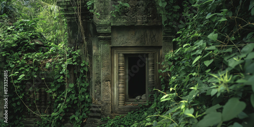 Ancient Overgrown Temple Entrance in Lush Jungle Landscape