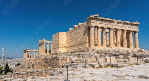 Ancient Parthenon ruins on a hilltop, clear blue sky