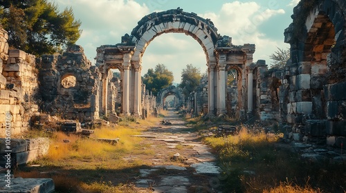Ancient Roman Ruins Under a Blue Sky with Stone Archway and Overgrown Pathway : Generative AI