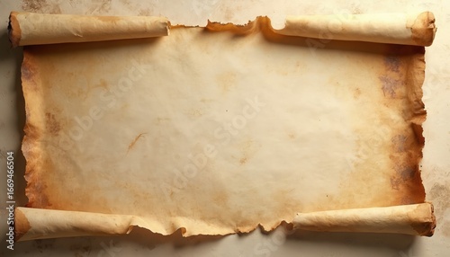 Ancient scroll of parchment papyrus with realistic antique texture, slightly torn, curled edges. Blank vintage document, resembling old manuscript map, perfect for history, fantasy, pirate themes.