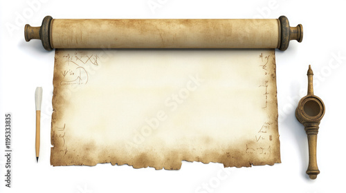 Ancient scroll with a quill and inkpot on a textured surface, showcasing historical writing tools and materials from past eras