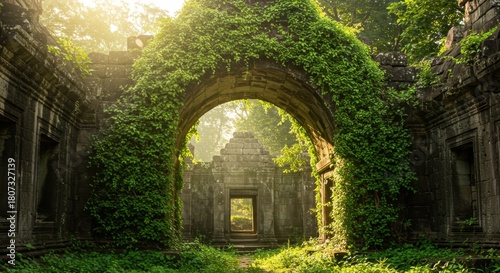 Ancient stone archway covered in vibrant green foliage within a jungle ruin