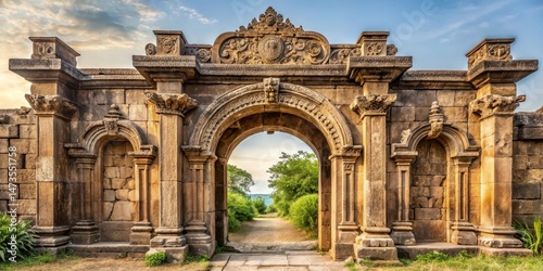Ancient stone gate with intricate carvings and arched entrance, gateway, temple, gateway