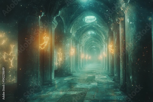 Ancient stone hallway, glowing symbols, ethereal ambiance.