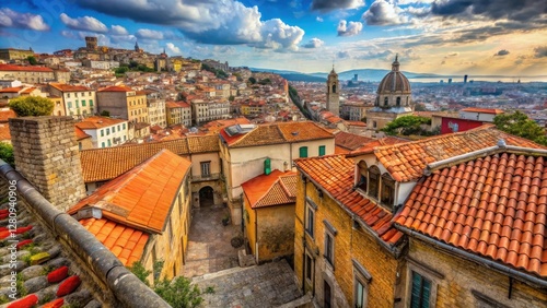 Ancient stone walls and red-tiled roofs of Naples historic center streets, naples