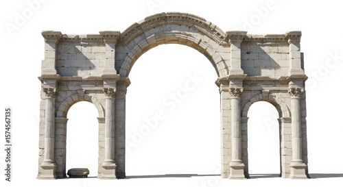 ancient white stone arch with Corinthian columns, dramatic shadows, ruins aesthetic, isolated on white background