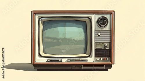 and keyword list based on the image Vintage Television Stands Proudly on a Beige Surface - A Blast from the Past