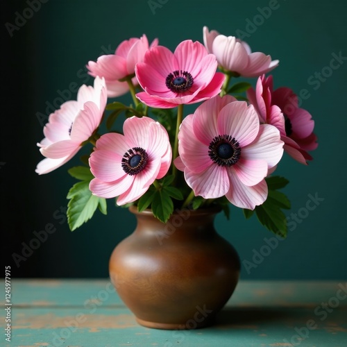 Anemone flowers in shades of pink and white in a vintage-inspired wooden vase, arrangement, rustic