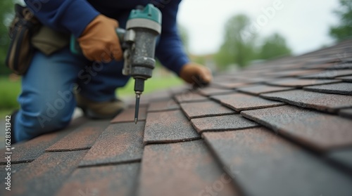 Angle view of roofing professional nailing shingles onto roof, focus on tool and layered shingle texture, construction site action.