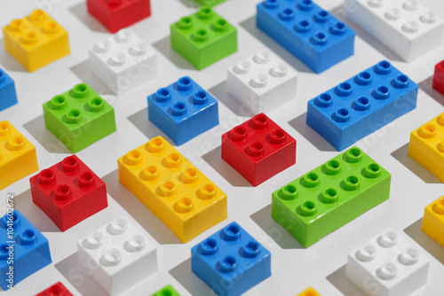 Angled view of rainbow colored building blocks toy bricks on white isolated background. The concept of educational games