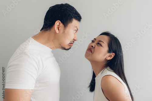 Angry couple lover in white t-shirt and grey background.