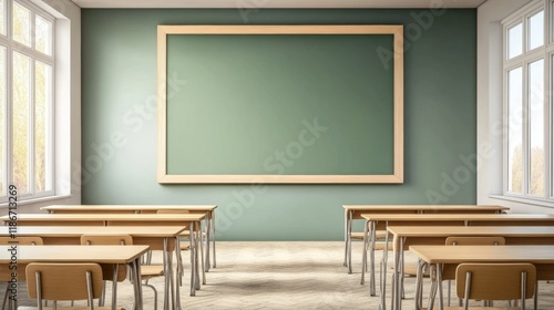 Anime-style high school classroom with blank chalkboard, wooden desks, soft daylight, neutral colors, simple background, Japanese animation style.