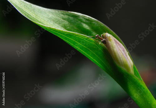 Ant on a twig, leaf. Insect and entymology concept. Insects living in the garden, outdoors. Pests and useful insects.