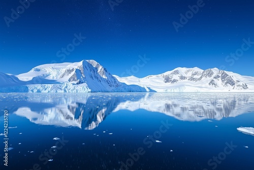 Antarctic Glacier Reflection. Massive Iceberg and Snowy Mountains Mirrored in Calm Arctic Waters. Pristine and Frozen Landscape. Ideal for Climate and Nature Themes. AI generated