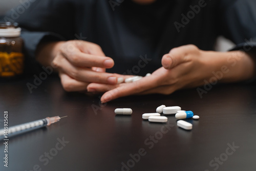 Anti drug, drug addict asian young woman, girl hand reaching for syringe, medicament with narcotic on table at home, abuse overdose. Sick pain of health, unhealthy people. Suicide depressed or despair