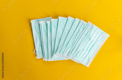 antibacterial medical mask of green color on yellow background, virus epidemic coronavirus protection.
