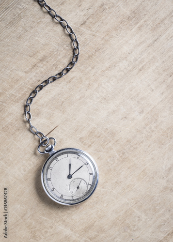 Antique clock on an old chain on a light wooden background