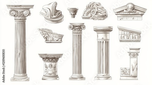 Antique Greek architectural elements include hand-drawn columns, pillars, and structures isolated on a white background.