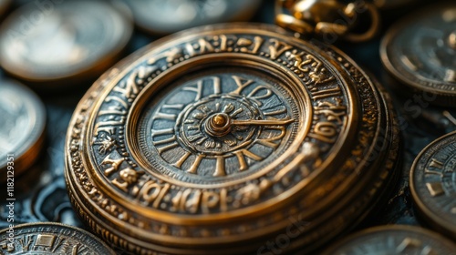 Antique Pocket Watch Amidst a Collection of Coins: A Timeless Treasure