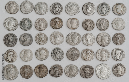 Antique Roman coins laid out in even rows