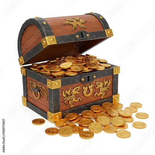 Antique Treasure Chest Overflowing with Golden Coins on White Background