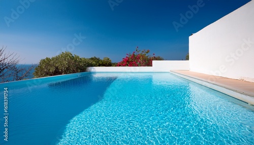 apchelle de piscine avec eau turquoise cristalline et mur blanc