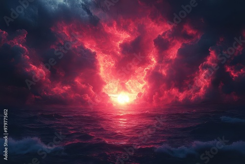 apocalyptic sky scene deep crimson clouds ominous dark red sunset silhouetted landscape atmospheric horror ambiance foreboding mood