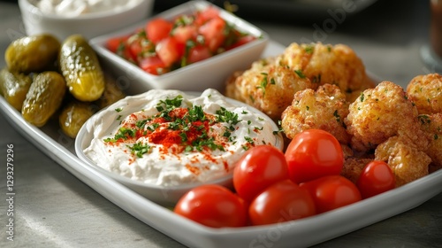 Appetizer Platter with Dips, Pickles, and Crispy Bites