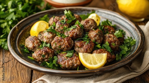 Appetizing Homemade Meatballs with Fresh Parsley and Juicy Lemon Wedges in Rustic Plate Close Up Photography