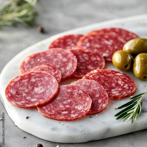 Appetizing salami slices presented on a pristine marble board accompanied by vibrant green olives and fragrant rosemary sprigs