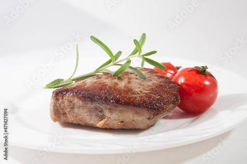 Appetizing steak well done on a white plate with tomatoes and rosemary