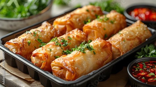 Appetizing Thai Spring Rolls in Black Plastic Container,Isolated on White Background,Close-up Side View