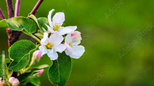 Apple flowers on a green background and place for text_
