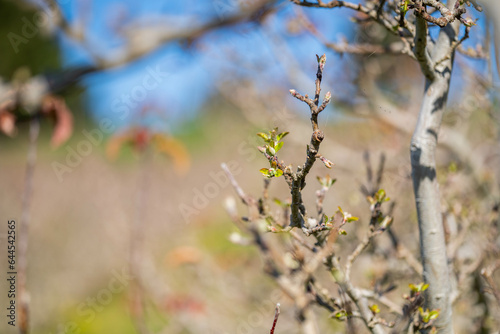 apple orchard getting new leaves in spring