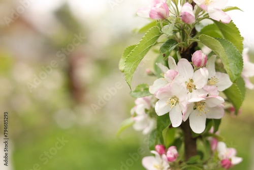 Apple tree with beautiful blossoms outdoors, space for text. Spring season