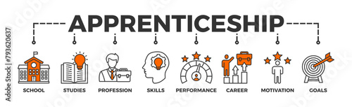 Apprenticeship banner web icon illustration concept with icon of school, studies, profession, skills, performance, career, motivation and goals