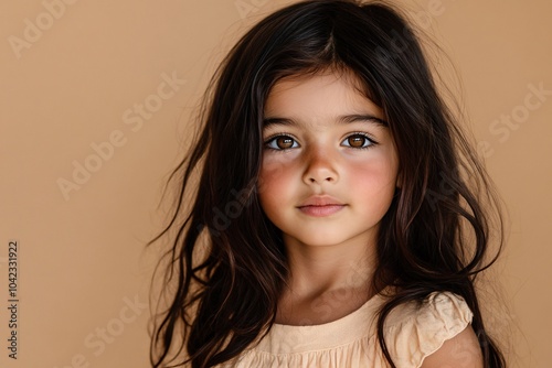Arab child girl with long dark hair and olive skin, posing on a beige background 1