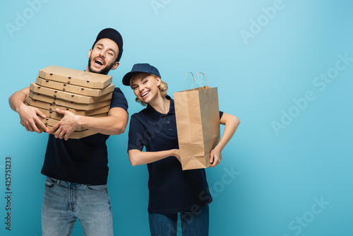 arabian delivery man laughing while holding pizza boxes near colleague with paper bag on blue