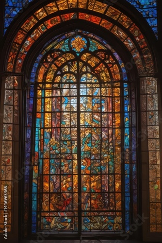 Arched stained glass window, vibrant hues, light streaming through , architecture, glass