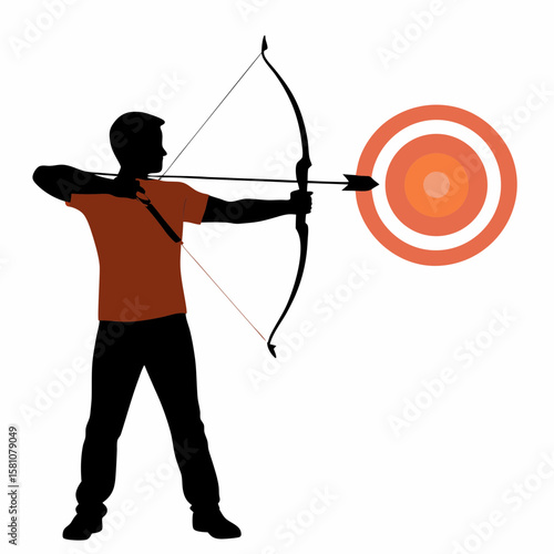Archer aiming at target with bow and arrow in silhouette style