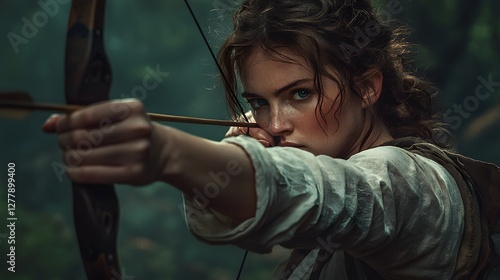 Archer aiming skillfully in dense forest action shot adventure close-up view focused determination