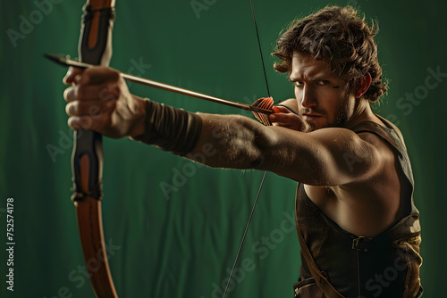 archer with a bow and arrow, isolated on a focused green background, symbolizing precision and concentration