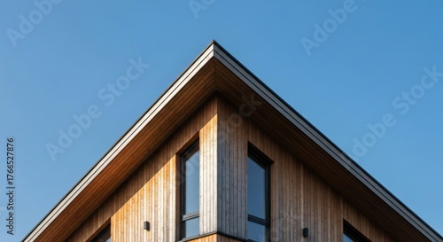 Architectural detail showing a building's corner with wood siding and a clear blue sky