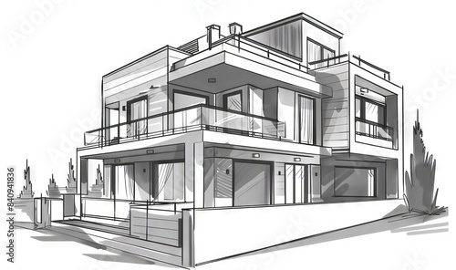 Architectural sketch of modern residential building, urban design, concept of architecture, city living, architectural drawing. Isolated on white background
