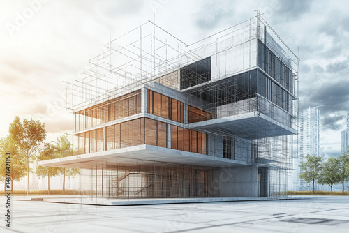 Architectural visualization of modern building with scaffolding and glass elements