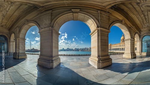 Archway view of a historic building overlooking a harbor