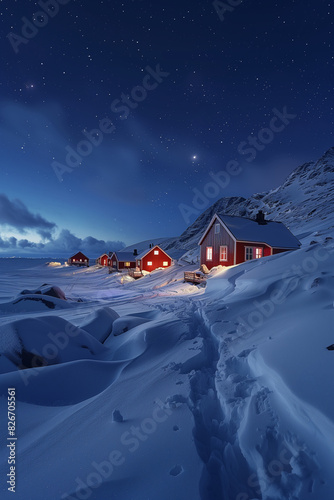 Arctic glaciers, red houses in the distance, lights, snow, auroras,